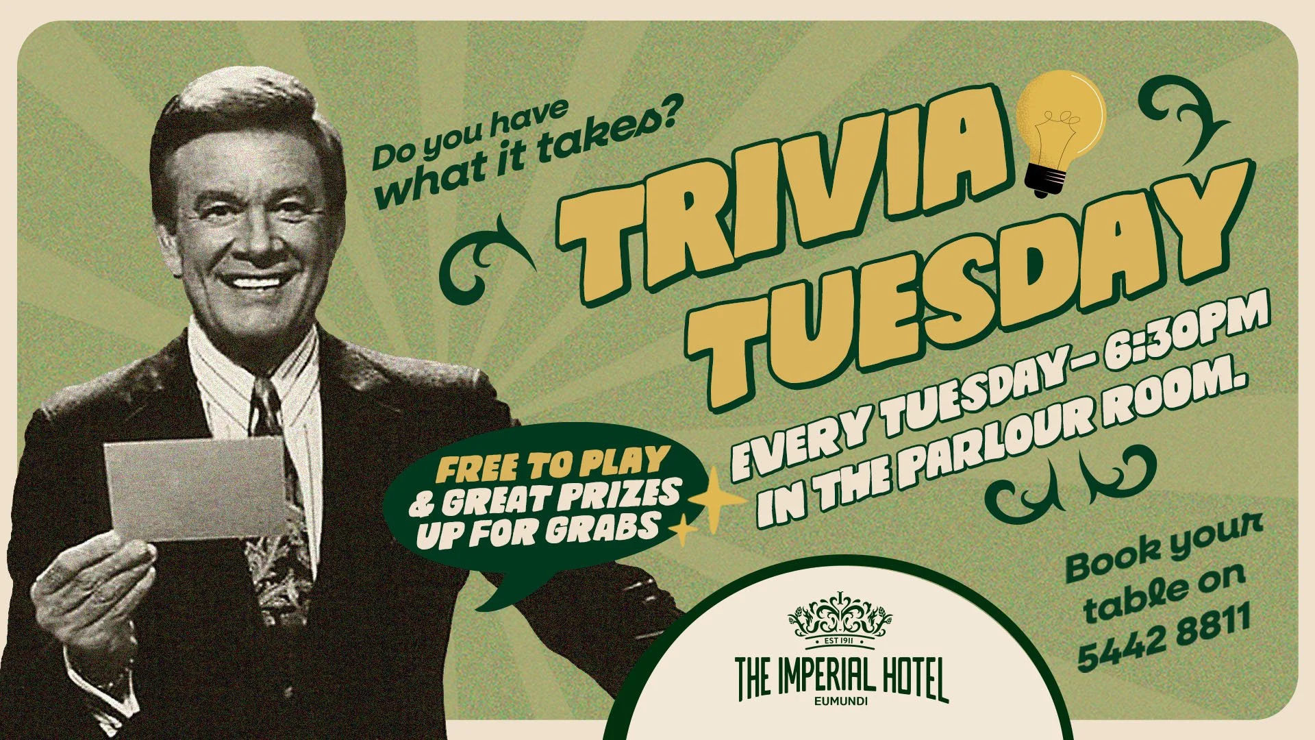 If you love trivia and game shows, you’ll be happy to hear that we have Trivia Tuesday taking place upstairs in The Parlour Room.